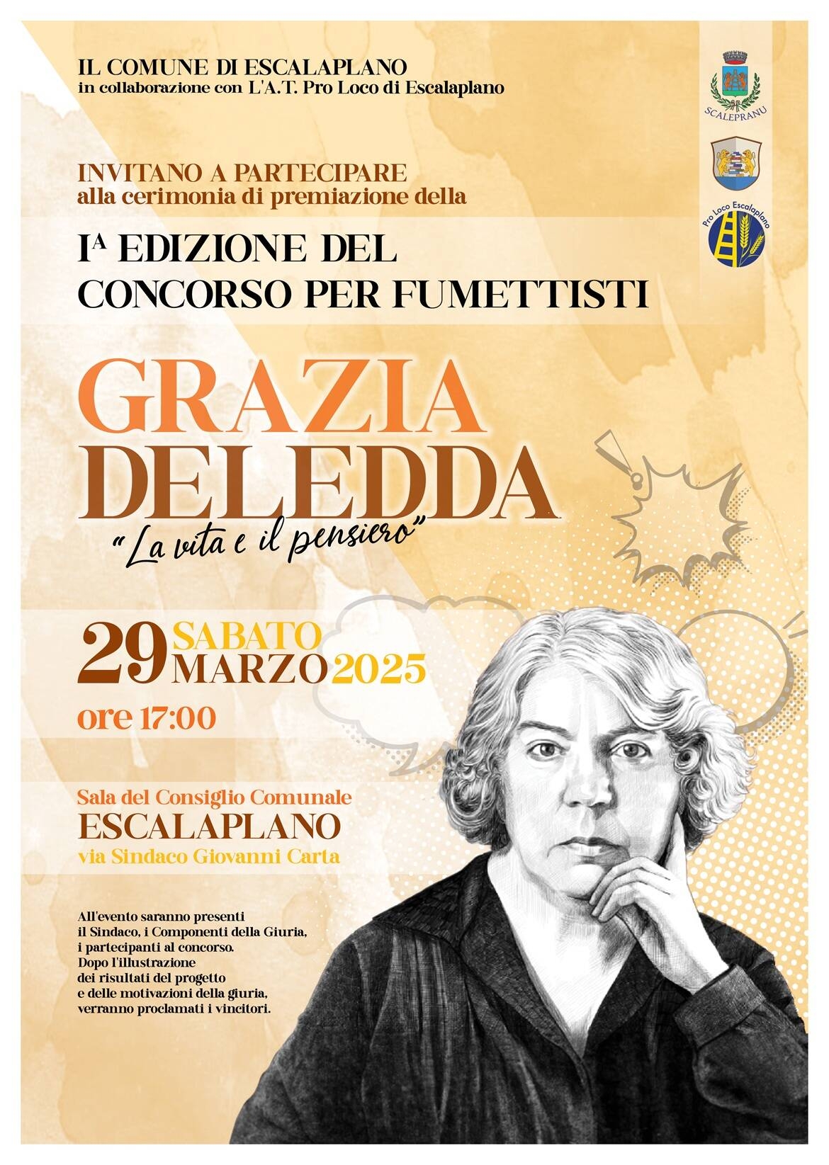 Il Comune di Escalaplano in collaborazione con l'A.T. Pro Loco di Escalaplano invitano la popolazione a partecipare alla cerimonia di premiazione della I edizione del Concorso per fumettisti "Grazia Deledda: la vita e il pensiero" che si terrà sabato 29 marzo 2025 alle ore 17:00 presso la sala del Consiglio Comunale.