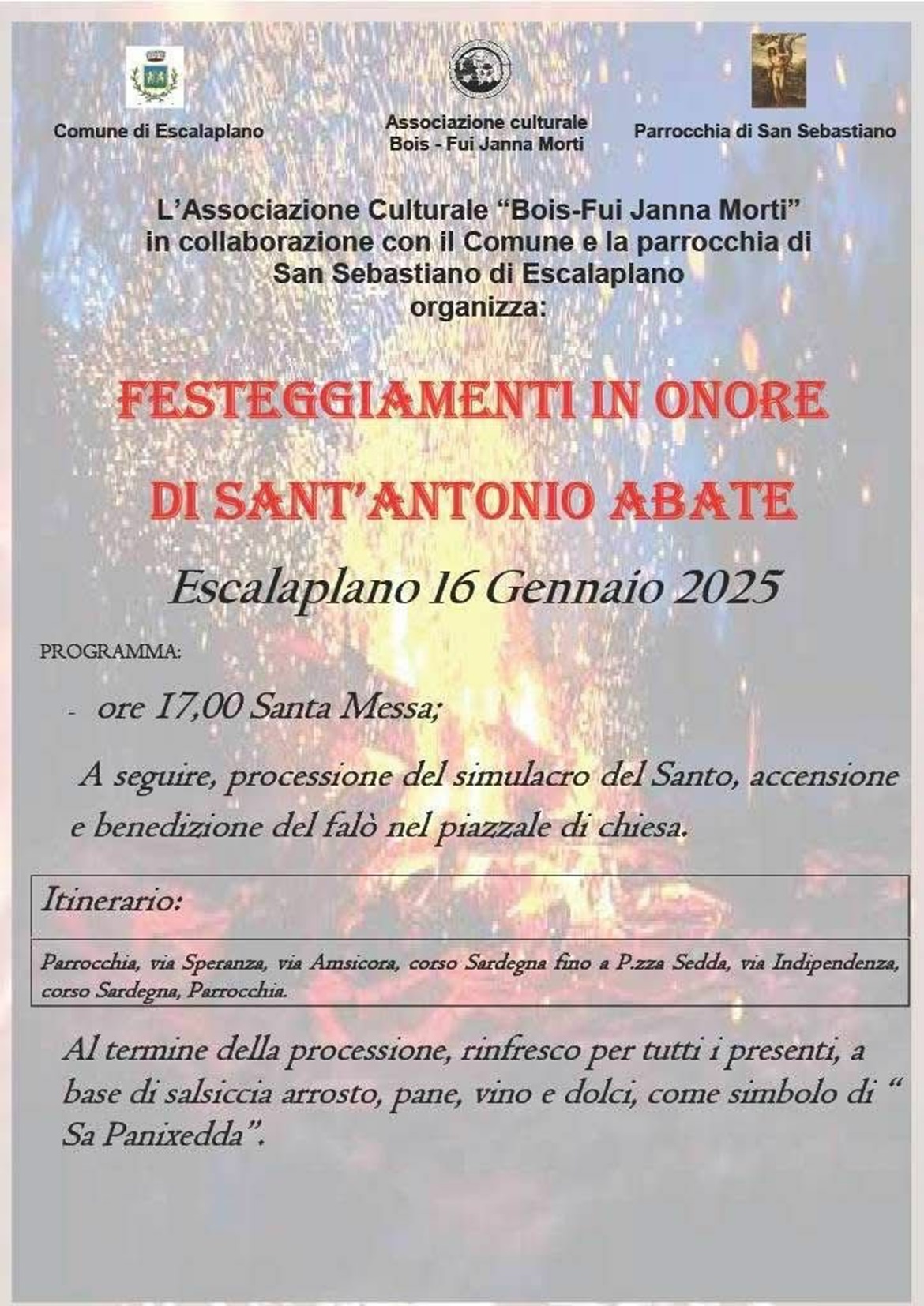 L'Associazione Culturale Bois - Fui Janna Morti in collaborazione con il Comune di Escalaplano e la parrocchia di San Sebastiano di Escalaplano organizzano Giovedì 16 gennaio 2025 i festeggiamenti in onore di sant'Antonio Abate.
