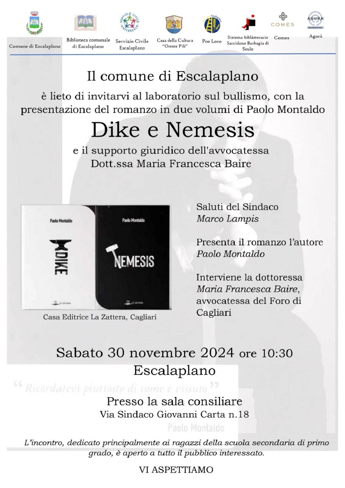 Il comune di Escalaplano è lieto di invitarvi al laboratorio sul bullismo, con la presentazione del romanzo in due volumi: