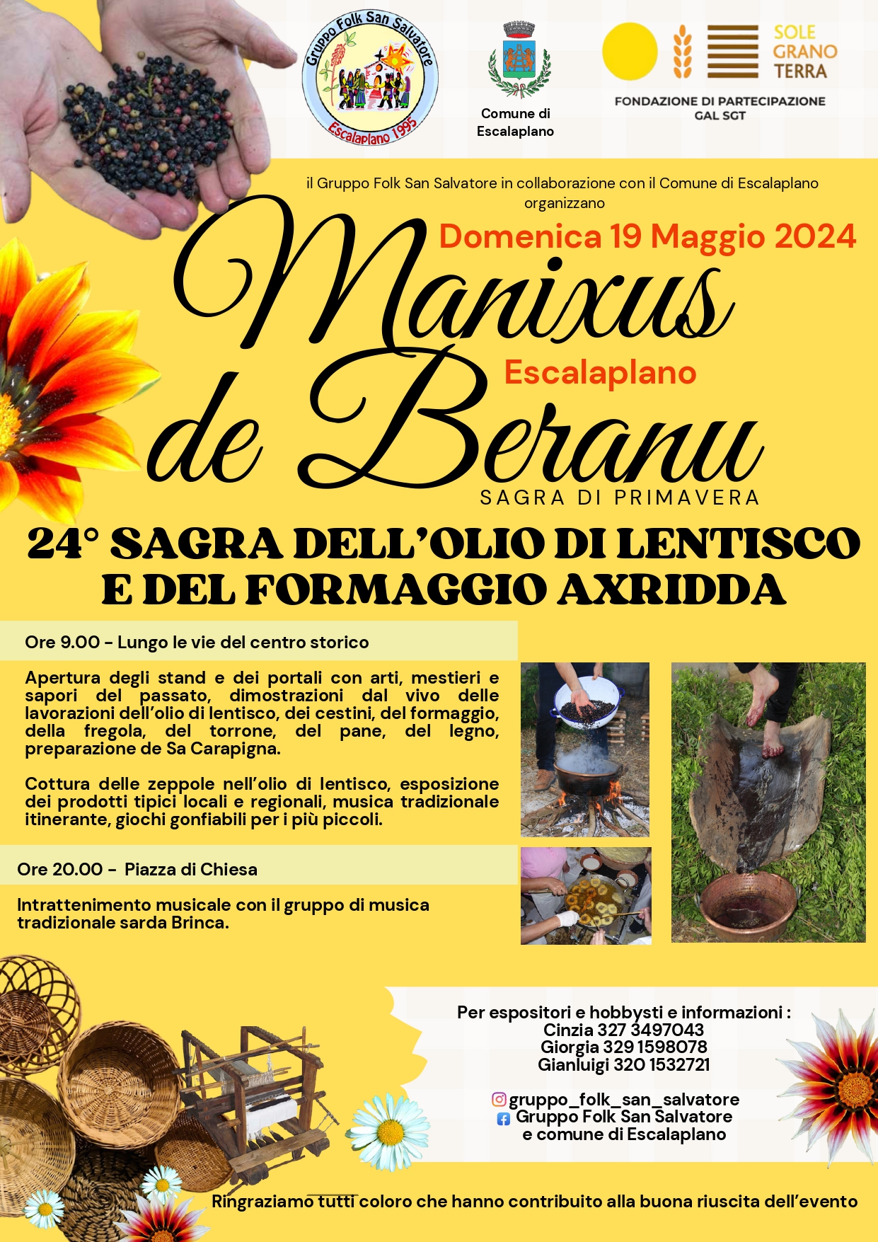 Apertura degli stand e dei portali con arti, mestieri e sapori del passato, dimostrazioni dal vivo delle lavorazioni dell’olio di lentisco, dei cestini, del formaggio, della fregola, del torrone, del pane, del legno, preparazione de Sa Carapigna. Cottura delle zeppole nell’olio di lentisco, esposizione dei prodotti tipici locali e regionali, musica tradizionale itinerante, giochi gonfiabili per i più piccoli.