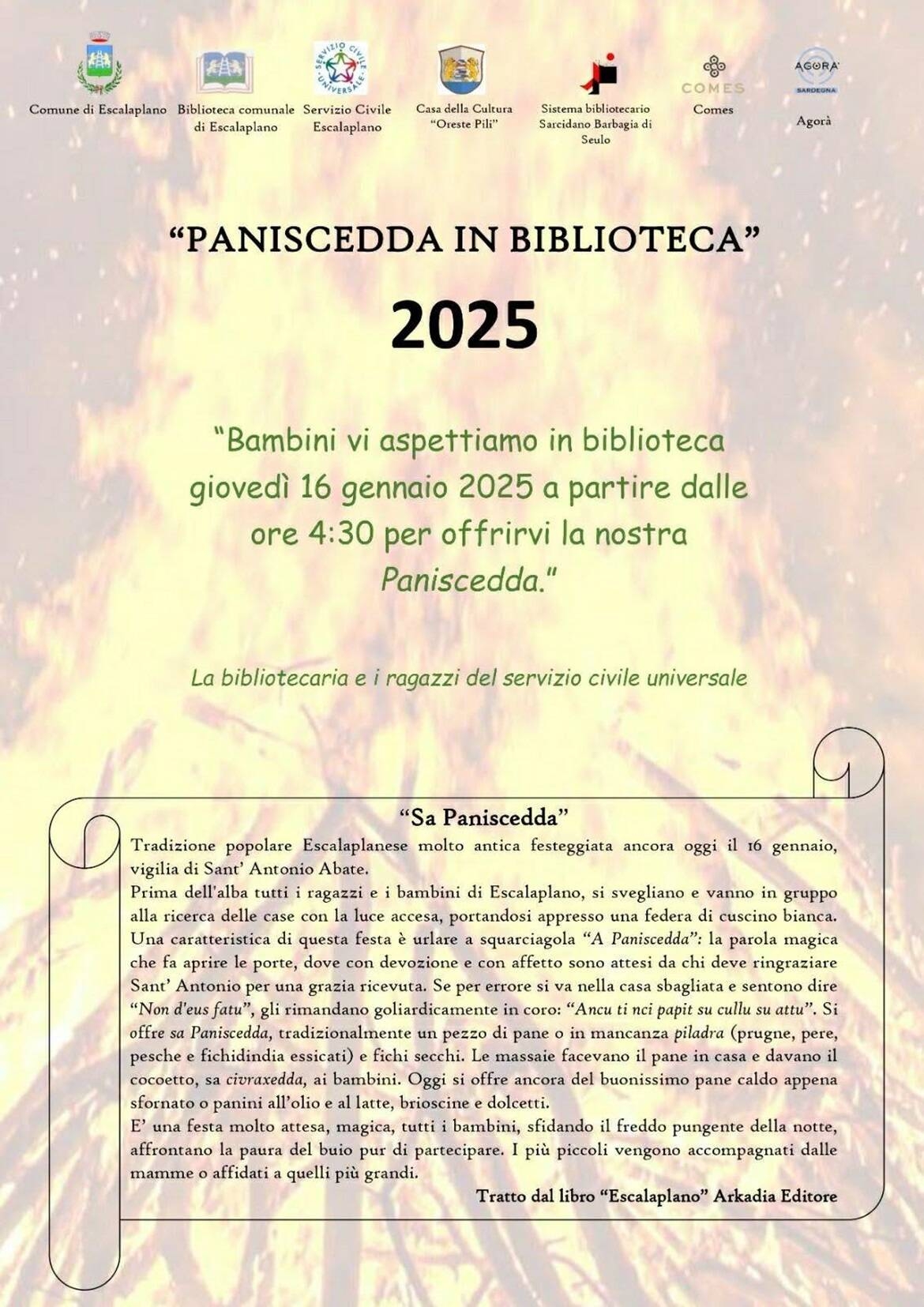 La Bibliotecaria e i ragazzi del Servizio Civile Universale vi aspettano in Biblioteca il 16 gennaio 2025 dalle ore 04:30 per offrirvi Sa Paniscedda.