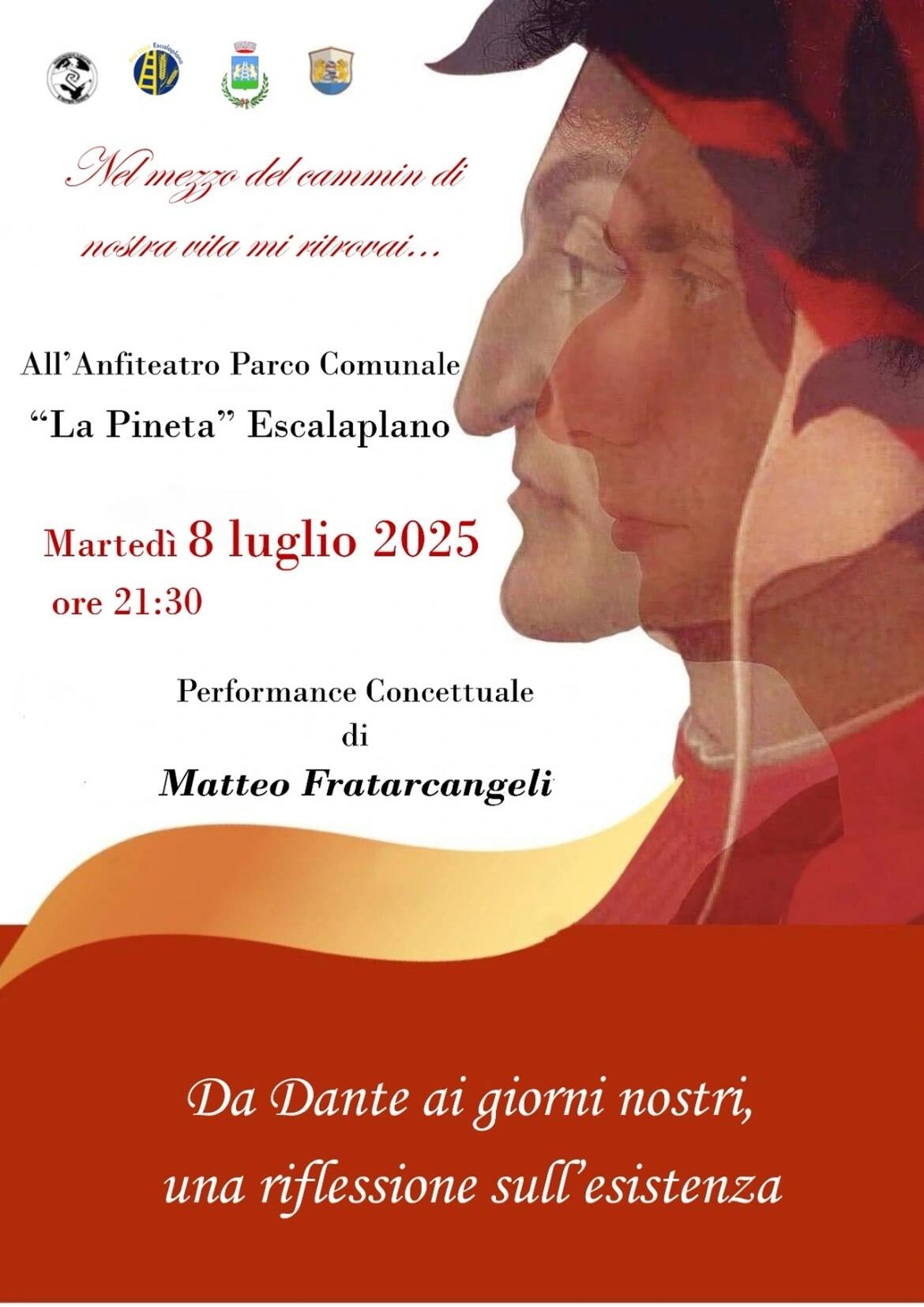 Si invita la popolazione martedì 8 luglio 2025 alle ore 21:30, presso l'anfiteatro del parco comunale "la Pineta", alla Performance concettuale di Matteo Fratarcangeli: "Da Dante ai giorni nostri, una riflessione sull'esistenza".