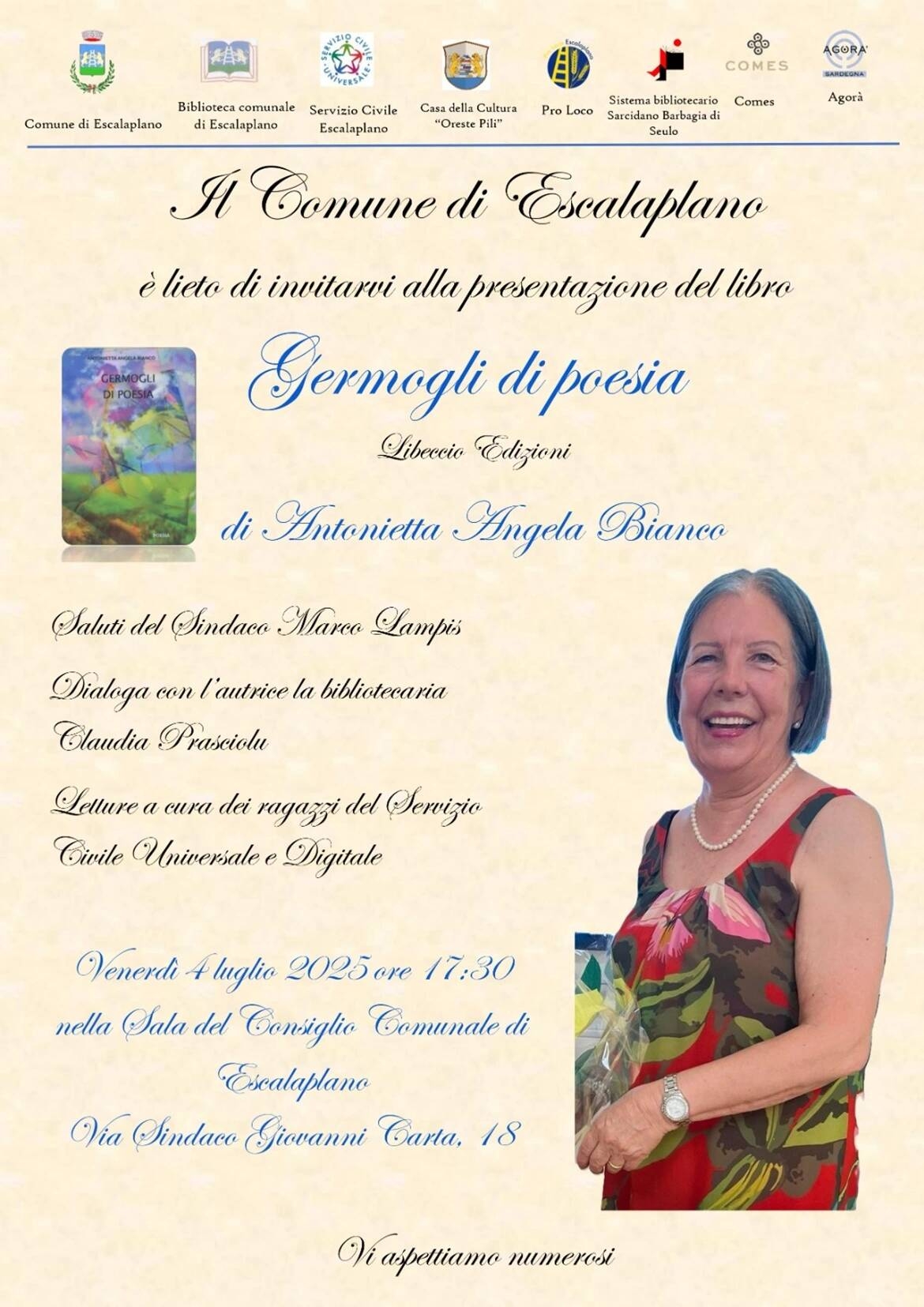 Il Comune di Escalaplano è lieto di invitare la popolazione alla presentazione del libro: "Germogli di poesia" di Antonietta Angela Bianco, venerdì 04/07/2025 alle ore 17:30 nella Sala del Consiglio Comunale di Escalaplano.