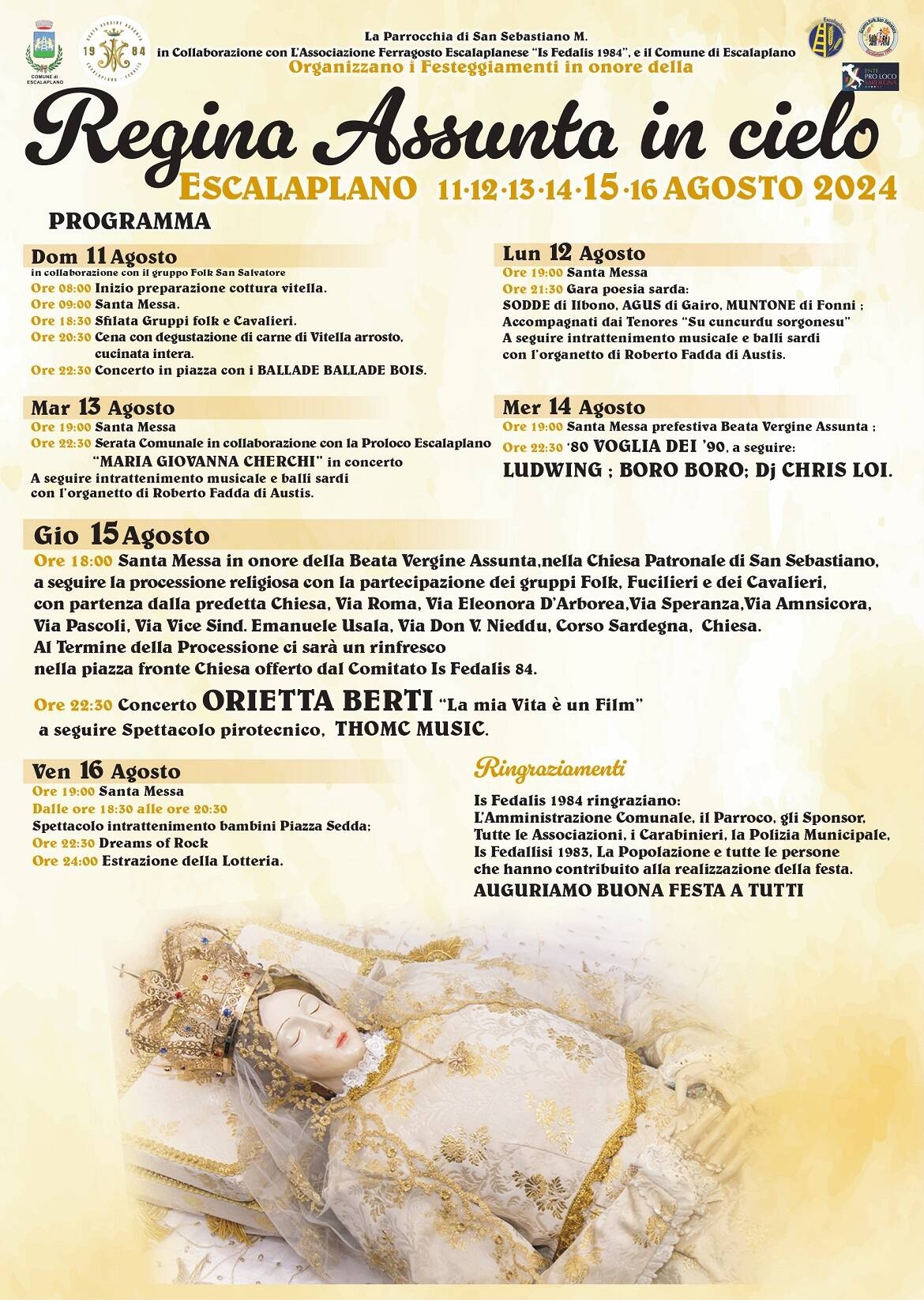 - Ore 18:00 Santa Messa in onore della Beata Vergine Assunta,nella Chiesa Patronale di San Sebastiano, a seguire la processione religiosa con la partecipazione dei gruppi Folk, Fucilieri e dei Cavalieri, con partenza dalla predetta Chiesa, Via Roma, Via Eleonora D’Arborea,Via Speranza,Via Amnsicora, Via Pascoli, Via Vice Sind. Emanuele Usala, Via Don V. Nieddu, Corso Sardegna, Chiesa.. Al Termine della Processione ci sarà un rinfresco nella piazza fronte Chiesa offerto dal Comitato Is Fedalis 84.