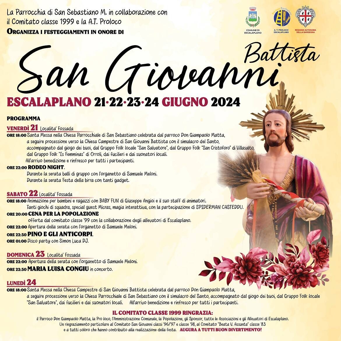 La Parrocchia San Sebastiano M. in collaborazione con il Comitato classe 1999 e l'Associazione A.T. ProLoco organizzano il 21-22-23-24 GIUGNO 2024,la festa in onore di: SAN GIOVANNI BATTISTA.